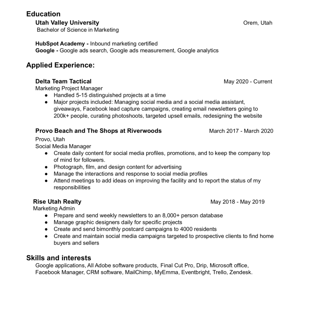 I’m an Experienced marketing manager with a demonstrated history of producing results in the E-commerce and service industry. Skilled in sales, team building, all aspects of marketing, Adobe products, and Microsoft Office. Strong marketing professional with a Bachelor’s Degree focused in Marketing from Utah Valley University.